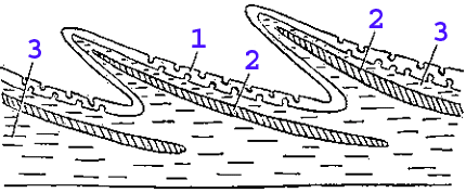 Рис. 2. Строение кожи костистой рыбы (схема): 1 — богатый железистыми клетками эпидермис; 2 — костная чешуя; 3 — соединительнотканный слой.