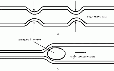Перистальтика — результат координированных сокращений продольных и поперечных мышц трубчатых органов. Одиночная волна П. — кольцевое сужение просвета органа, передвигающееся по его длине. Стенки органа впереди сужения всегда несколько расслаблены, так что волна как бы продавливает содержимое в направлении своего движения. Волны П. следуют друг за другом непрерывно с определёнными ритмом и скоростью. Так, у человека ритм перистальтики желудка — 3 волны в 1 минуту, скорость прохождения волны — 0,5 см/сек; ритм П. кишечника — 6 волн в 1 минуту.